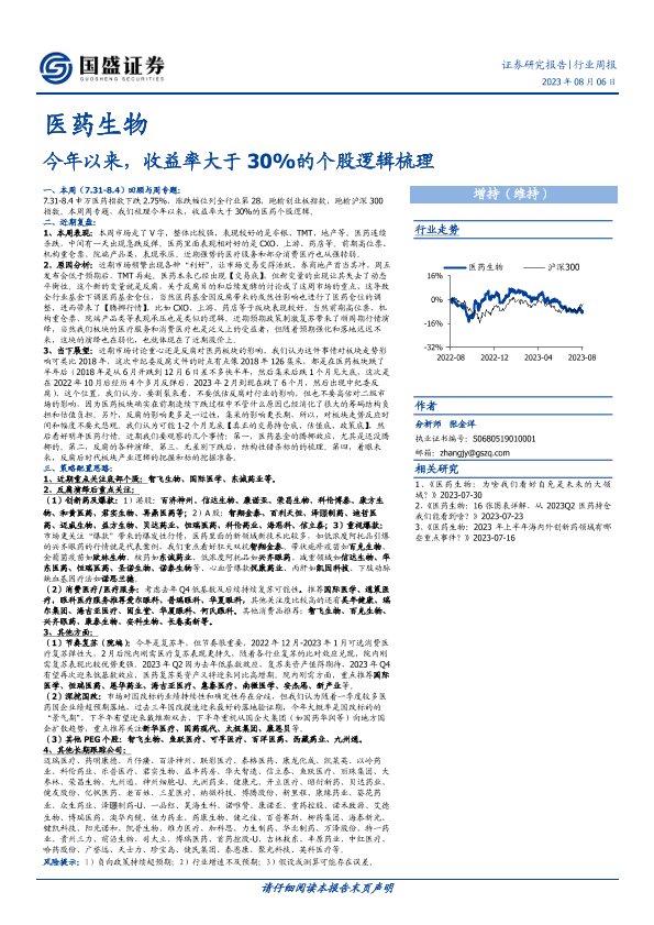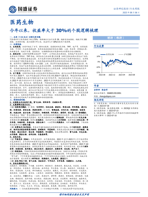 【国盛证券】【20230806】医药生物行业周报:今年以来,收益率大于30%的个股逻辑梳理-24页
