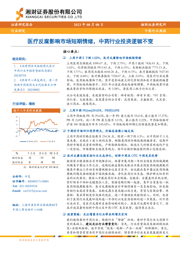 【湘财证券】【20230808】中药行业周报:医疗反腐影响市场短期情绪,中药行业投资逻辑不变-12页