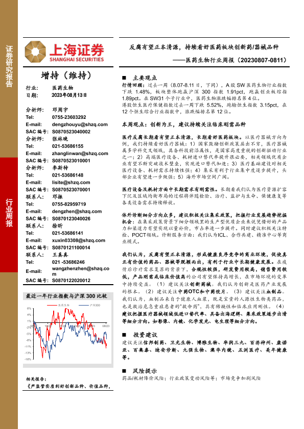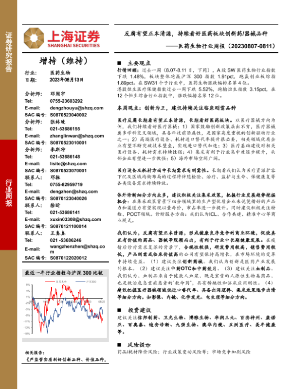 【上海证券】【20230813】医药生物行业周报:反腐有望正本清源,持续看好医药板块创新药/器械品种-23页