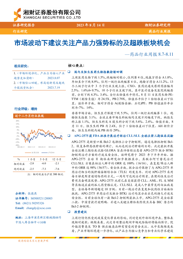 【湘财证券】【20230814】药品行业周报:市场波动下建议关注产品力强势标的及超跌板块机会-14页