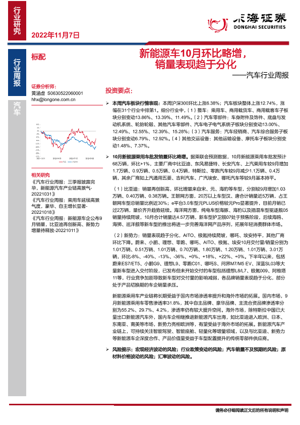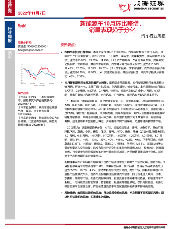 【东海证券】【20221107】汽车行业周报:新能源车10月环比略增,销量表现趋于分化-17页