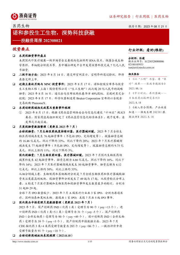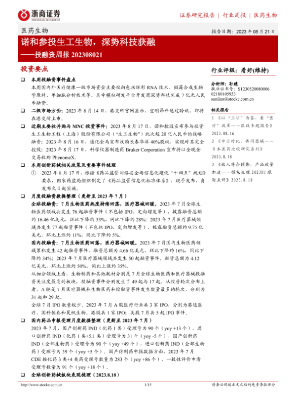 【浙商证券】【20230821】医药生物投融资周报:诺和参投生工生物,深势科技获融-15页