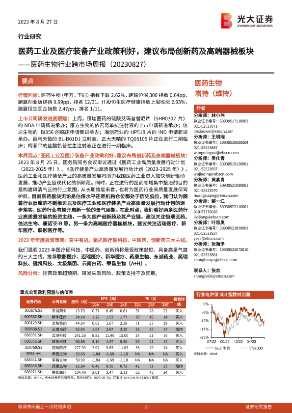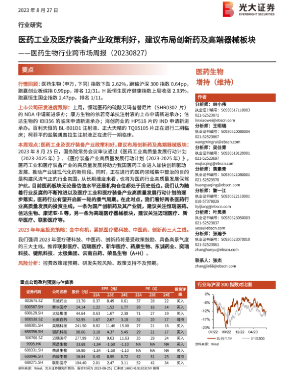【光大证券】【20230827】医药生物行业跨市场周报:医药工业及医疗装备产业政策利好,建议布局创新药及高端器械板块-24页