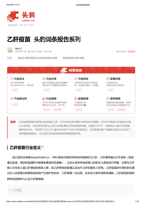 【头豹研究院】【20230728】乙肝疫苗 头豹词条报告系列-18页