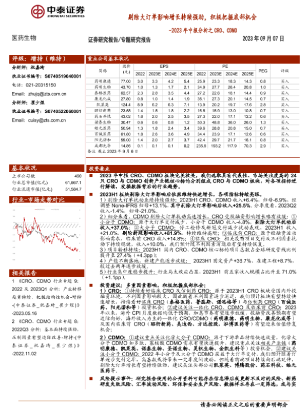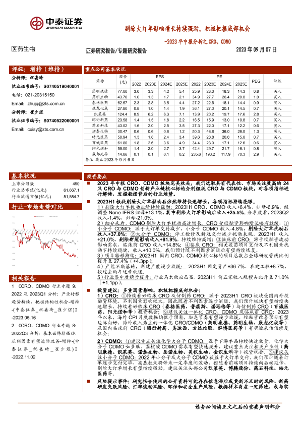 【中泰证券】【20230907】2023年中报分析之CRO、CDMO-剔除大订单影响增长持续强劲,积极把握底部机会-14页