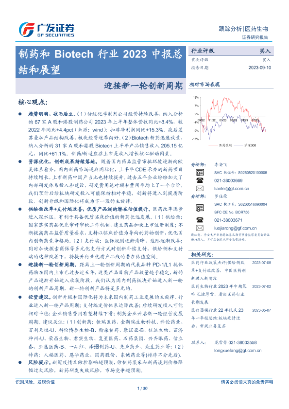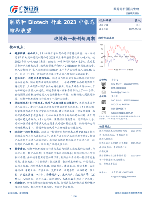 【广发证券】【20230910】制药和Biotech行业2023中报总结和展望:迎接新一轮创新周期-30页