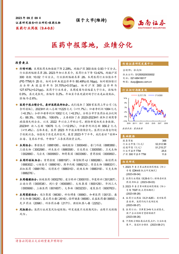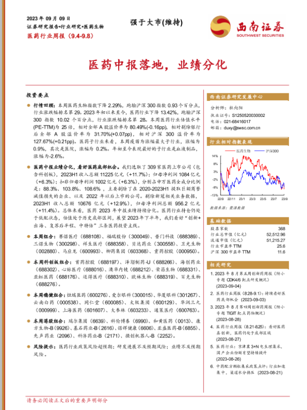 【西南证券】【20230909】医药行业周报:医药中报落地,业绩分化-35页