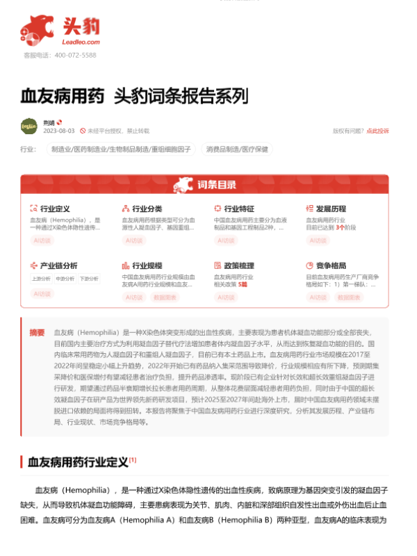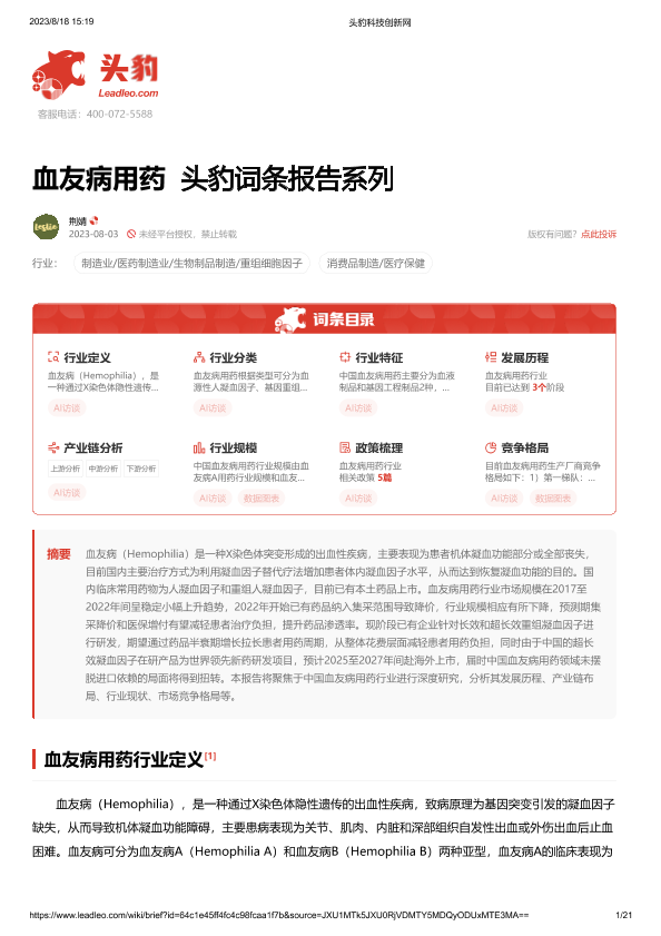 【头豹研究院】【202308】血友病用药 头豹词条报告系列-21页