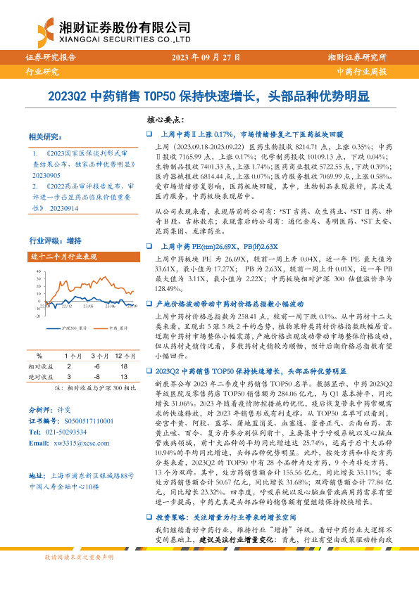 【湘财证券】【20230927】2023Q2中药销售TOP50保持快速增长,头部品种优势明显-12页