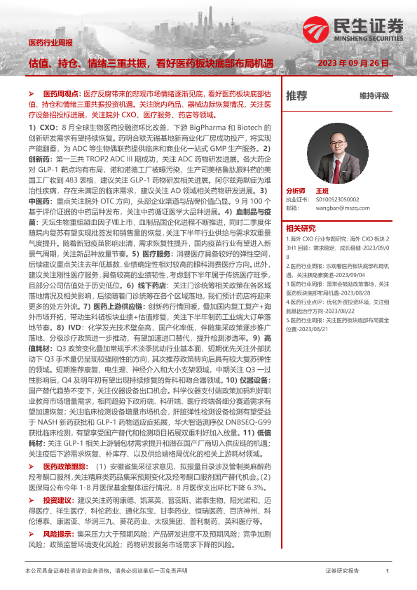 【民生证券】【20230926】医药行业周报:估值、持仓、情绪三重共振,看好医药板块底部布局机遇-43页