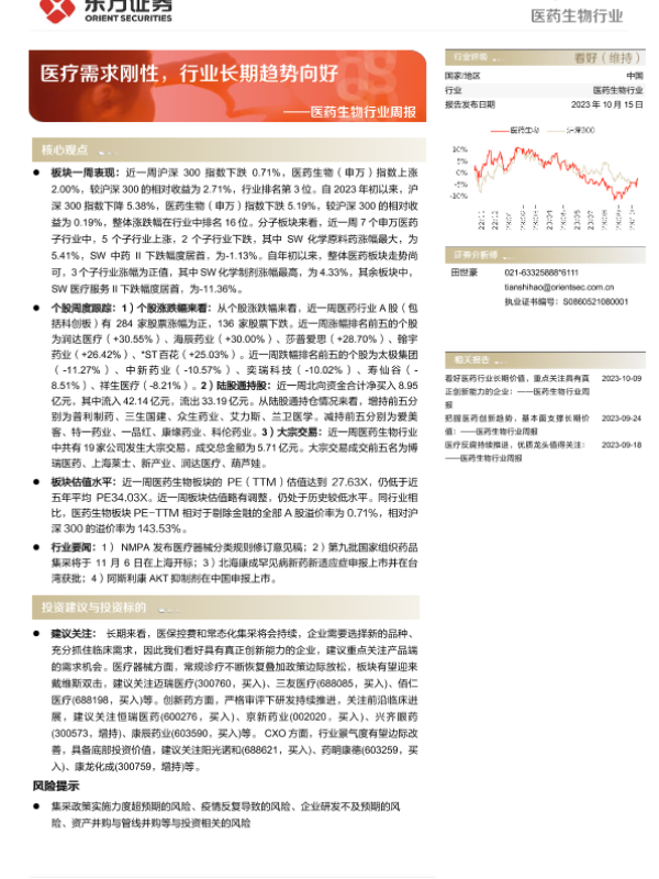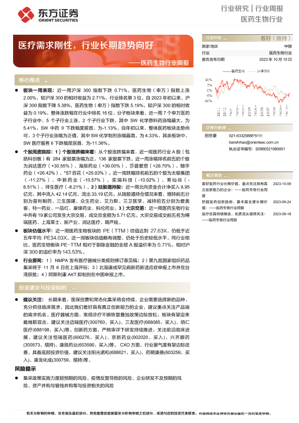 【东方证券】【20231015】医药生物行业周报:医疗需求刚性,行业长期趋势向好-10页