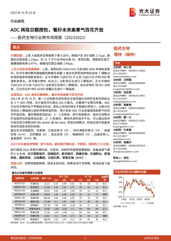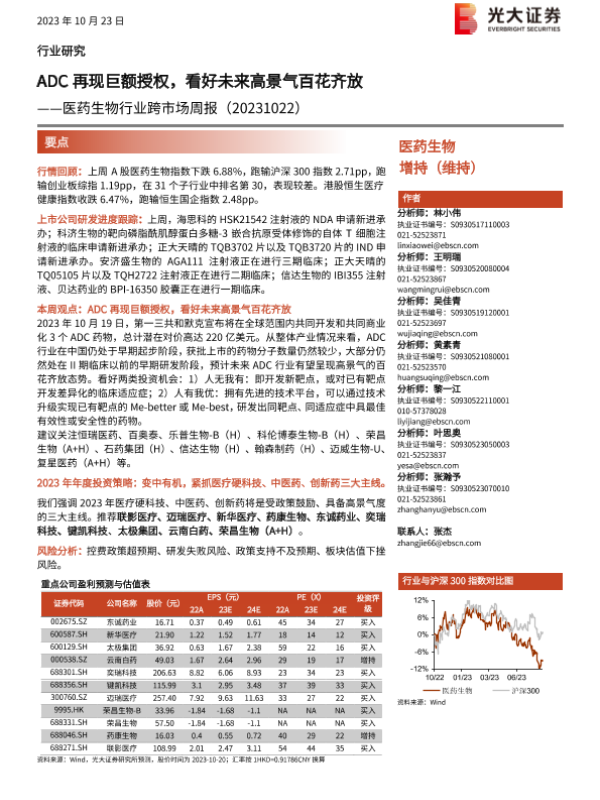 【光大证券】【20231023】医药生物行业跨市场周报:ADC再现巨额授权,看好未来高景气百花齐放-22页