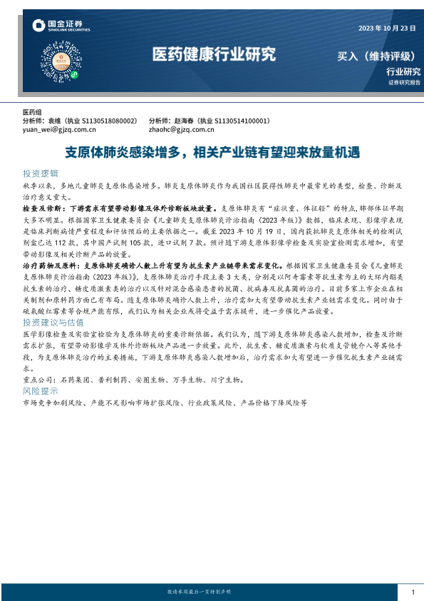 【国金证券】【20231023】医药健康行业研究:支原体肺炎感染增多,相关产业链有望迎来放量机遇-12页