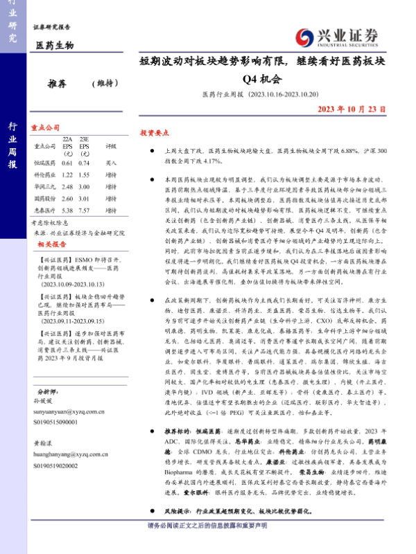 【兴业证券】【20231023】医药行业周报:短期波动对板块趋势影响有限,继续看好医药板块Q4机会-16页