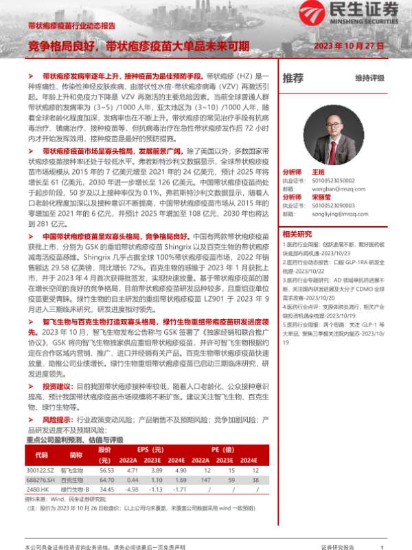 【民生证券】【20231027】带状疱疹疫苗行业动态报告:竞争格局良好,带状疱疹疫苗大单品未来可期-17页