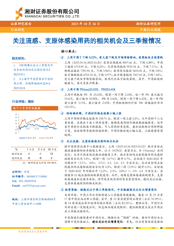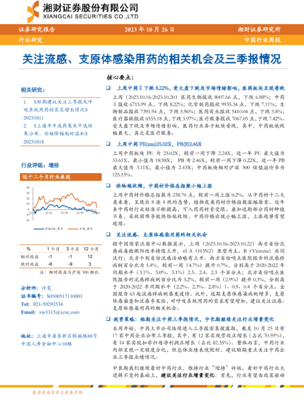 【湘财证券】【20231026】中药行业周报:关注流感、支原体感染用药的相关机会及三季报情况-12页