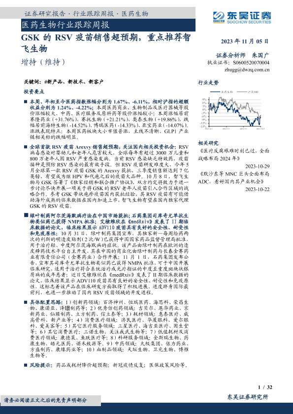 【东吴证券】【20231105】医药生物行业跟踪周报:GSK的RSV疫苗销售超预期,重点推荐智飞生物-32页