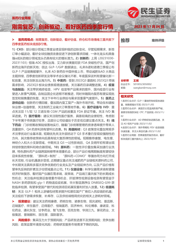【民生证券】【20231106】医药行业周报:刚需复苏,创新驱动,看好医药四季度行情-37页