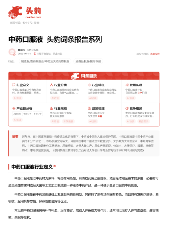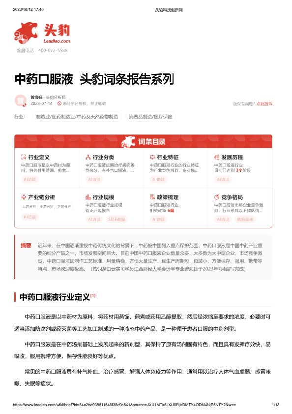 【头豹研究院】【2023】中药口服液 头豹词条报告系列-18页