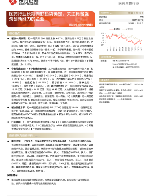 【东方证券】【20231112】医药生物行业周报:医药行业长期向好趋势确定,关注具备强劲创新能力的企业-10页