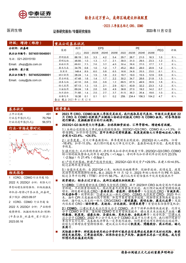 【中泰证券】【20231112】2023三季报总结之CRO、CDMO:轻舟正过万重山,底部区域建议积极配置-11页