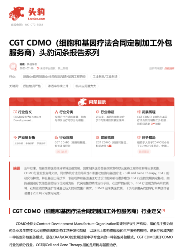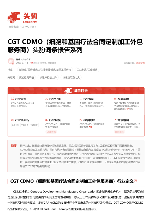 【头豹研究院】【2023】CGT CDMO(细胞和基因疗法合同定制加工外包服务商)头豹词条报告系列-17页