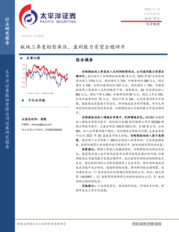 【太平洋证券】【20231113】化学制药行业深度报告:板块三季度短暂承压,盈利能力有望企稳回升-14页