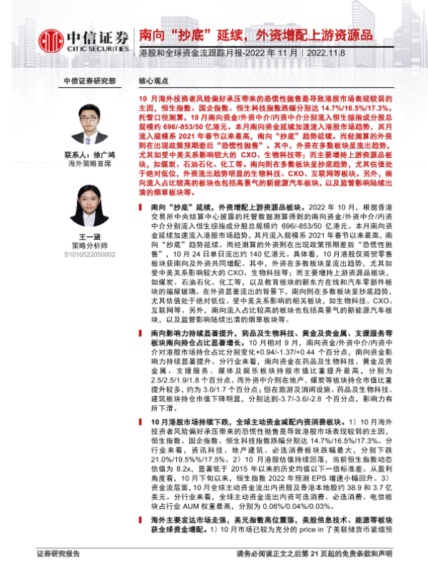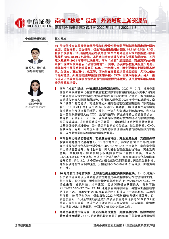 【中信证券】【20221108】港股和全球资金流跟踪月报2022年11月:南向“抄底”延续,外资增配上游资源品-22页
