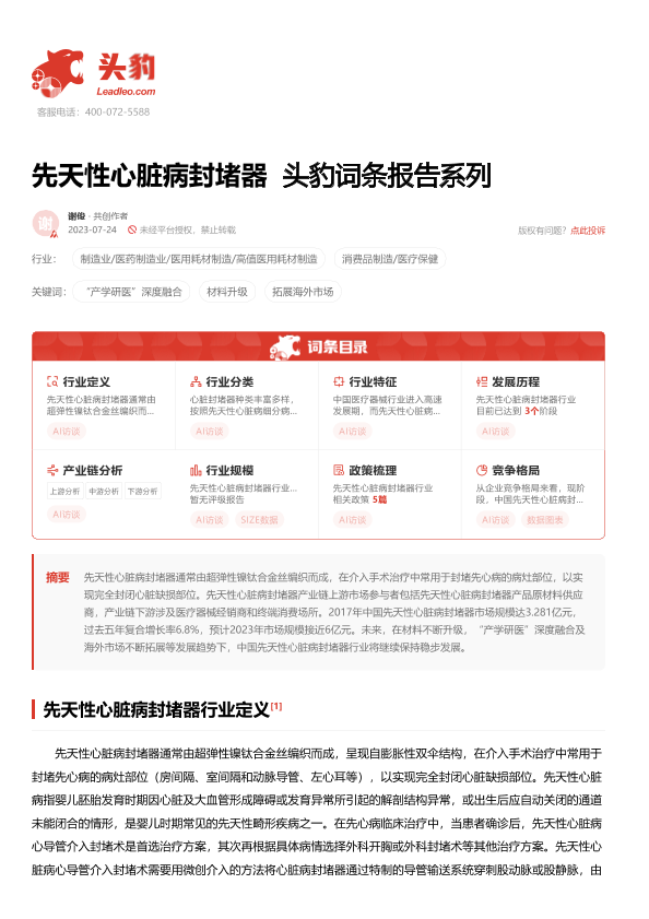 【头豹研究院】【2023】先天性心脏病封堵器 头豹词条报告系列-17页