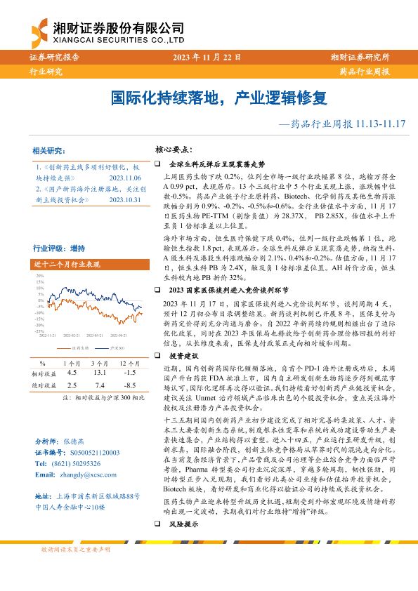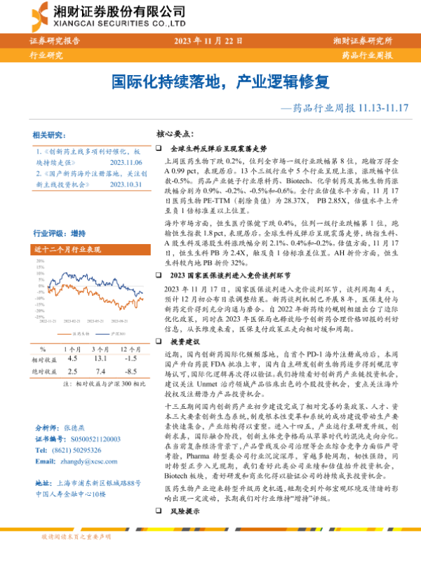 【湘财证券】【20231122】药品行业周报:国际化持续落地,产业逻辑修复-14页