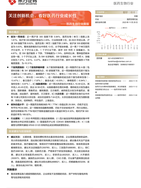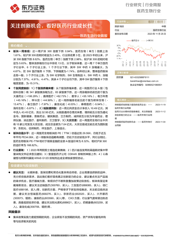 【东方证券】【20231125】医药生物行业周报:关注创新机会,看好医药行业成长性-11页