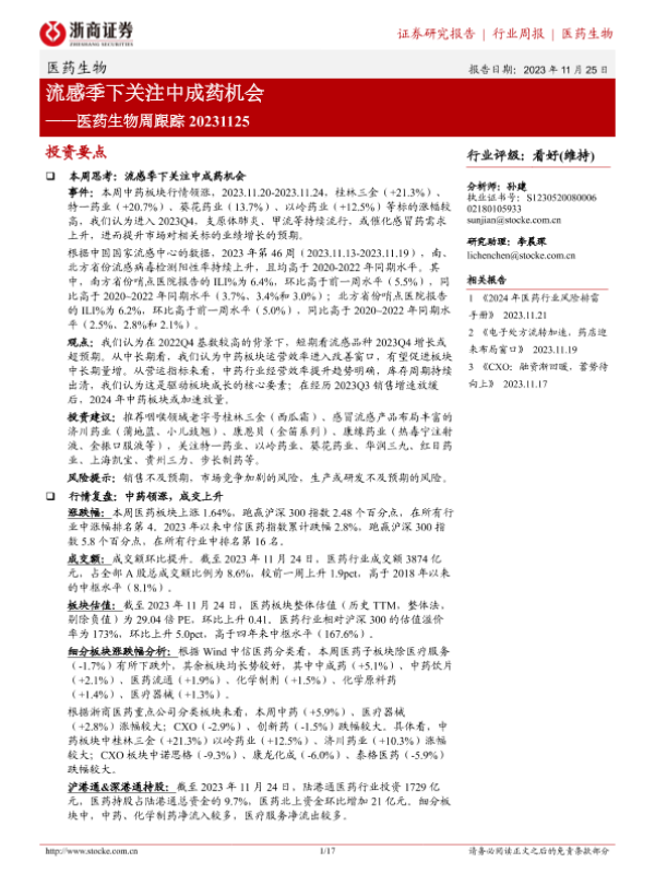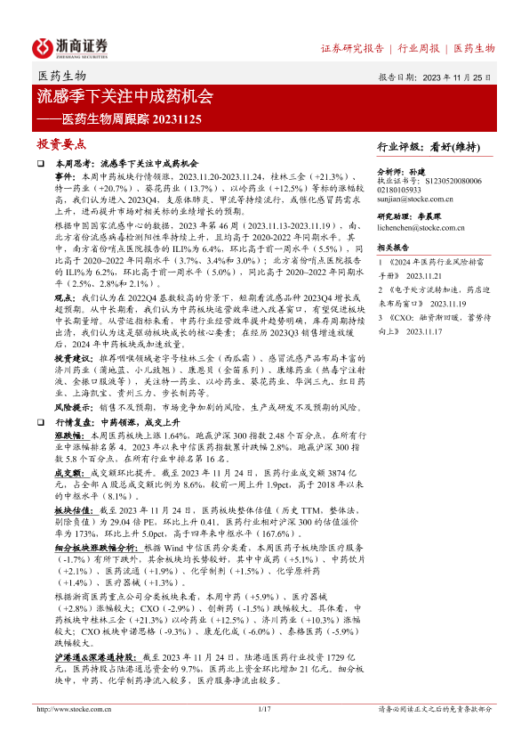 【浙商证券】【20231125】医药生物周跟踪:流感季下关注中成药机会-17页
