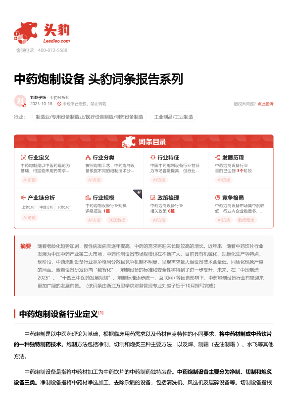 【头豹研究院】【20231018】中药炮制设备 头豹词条报告系列-18页