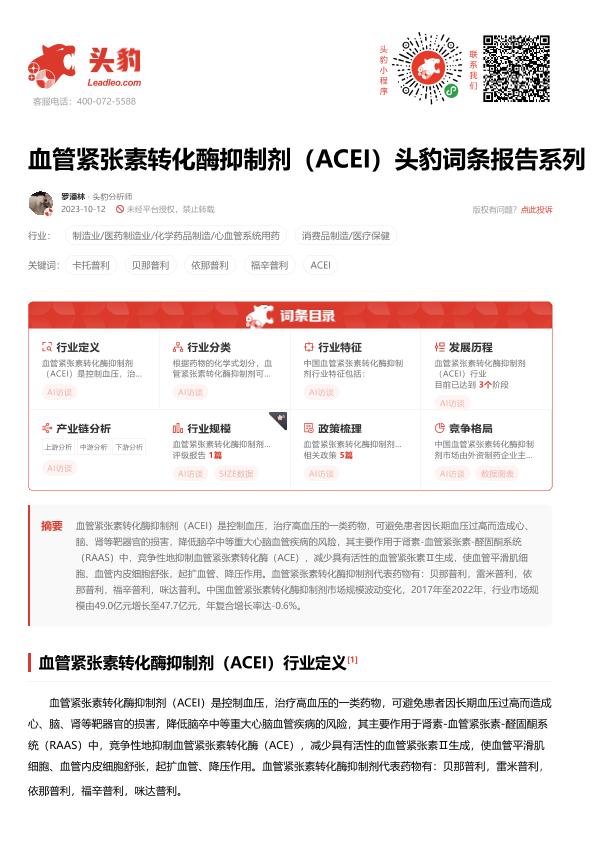 【头豹研究院】【20231012】血管紧张素转化酶抑制剂(ACEI)头豹词条报告系列-16页