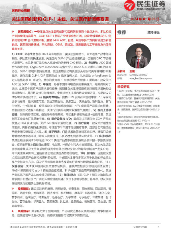 【民生证券】【20240103】医药行业周报:关注医药创新和GLP-1主线,关注医疗新消费赛道-28页
