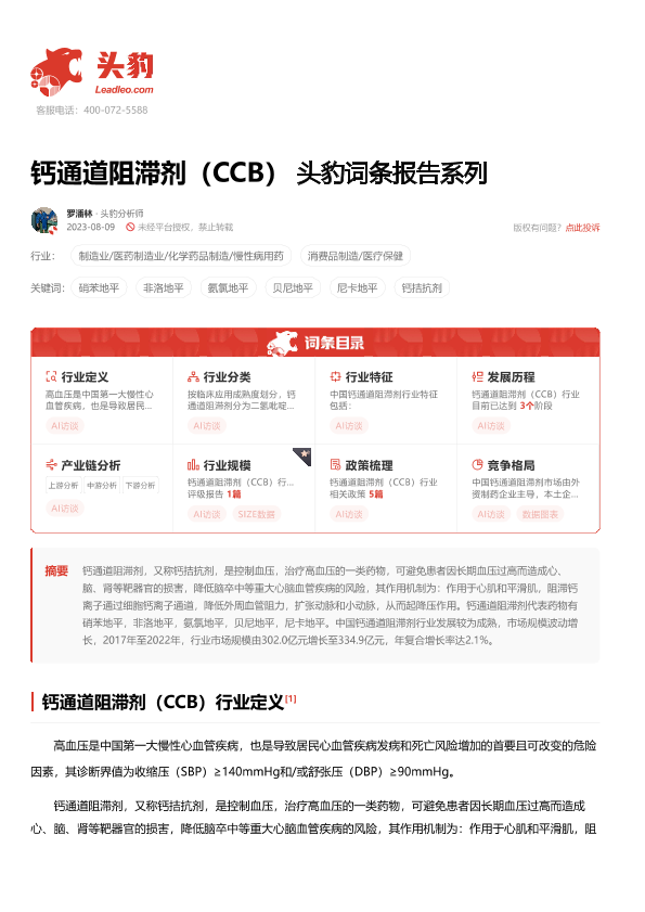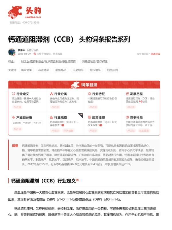 【头豹研究院】【20240104】钙通道阻滞剂(CCB)头豹词条报告系列-16页