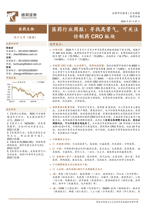 【德邦证券】【20240107】医药行业周报:寻找高景气,可关注仿制药CRO板块-16页