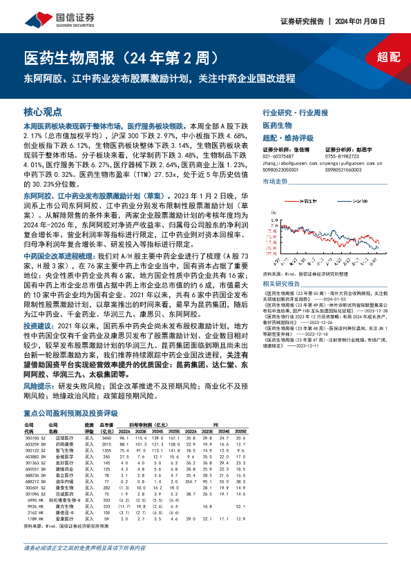 【国信证券】【20240108】医药生物周报:东阿阿胶、江中药业发布股票激励计划,关注中药企业国改进程-20页