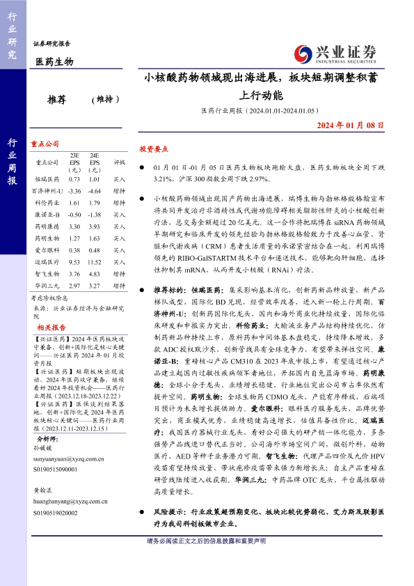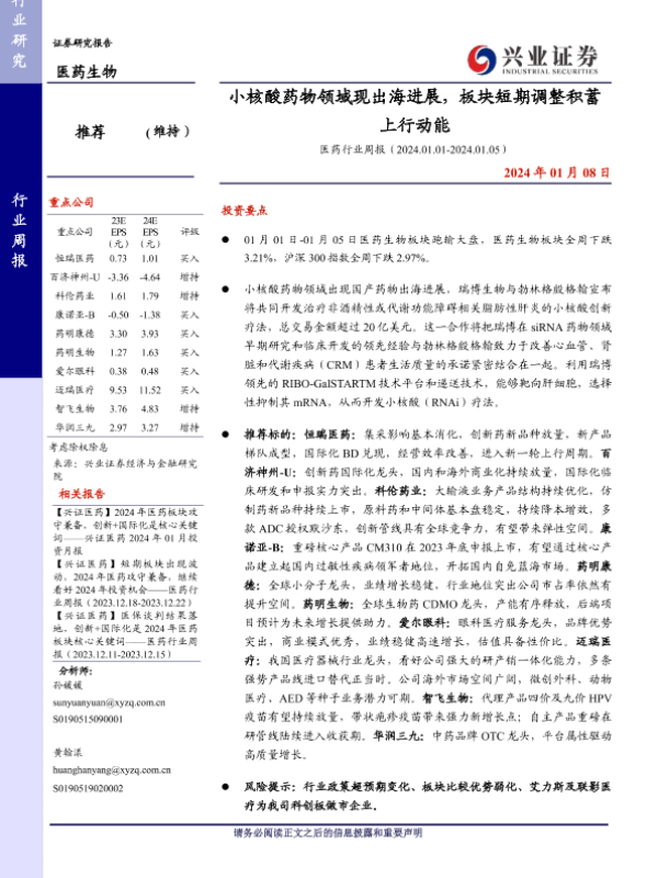 【兴业证券】【20240108】医药行业周报:小核酸药物领域现出海进展,板块短期调整积蓄上行动能-17页