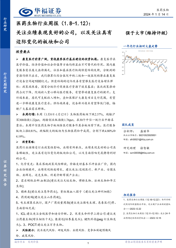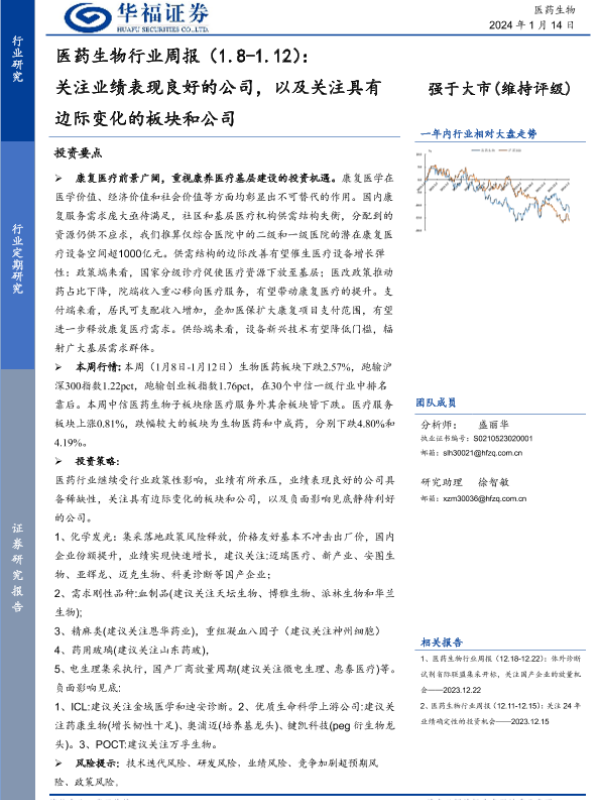 【华福证券】【20240114】医药生物行业周报:关注业绩表现良好的公司,以及关注具有边际变化的板块和公司-10页