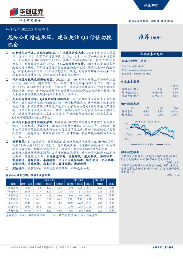 【华创证券】【20221107】环保行业2022Q3业绩综述:龙头公司增速承压,建议关注Q4估值切换机会-18页