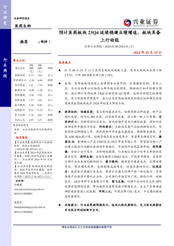 【兴业证券】【20240115】医药行业周报:预计医药板块23Q4延续稳健业绩增速,板块具备上行动能-16页
