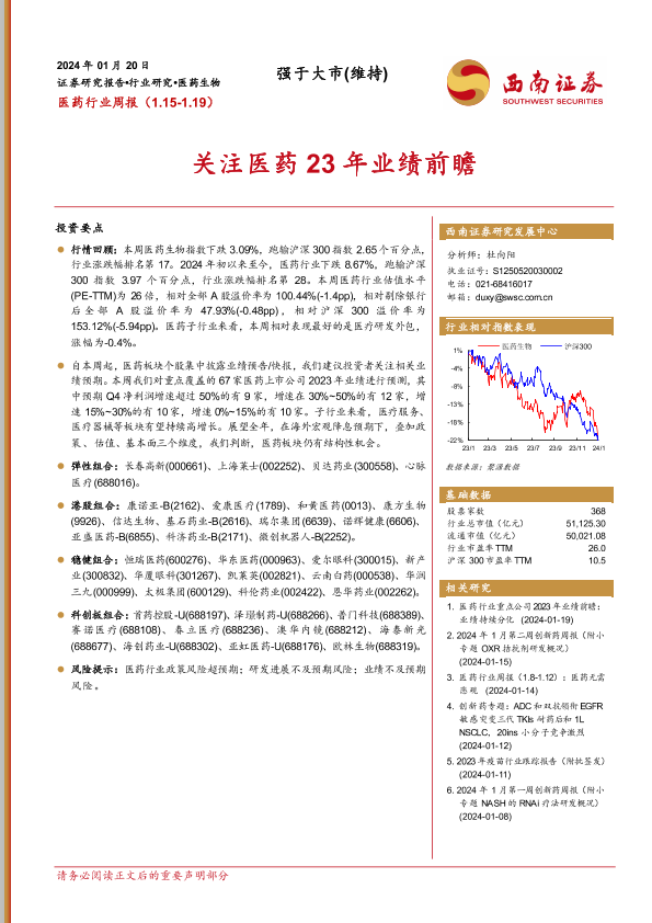 【西南证券】【20240120】医药行业周报:关注医药23年业绩前瞻-32页