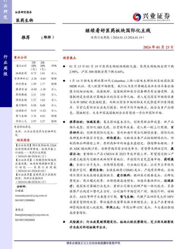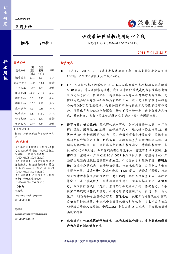 【兴业证券】【20240123】医药行业周报:继续看好医药板块国际化主线-19页