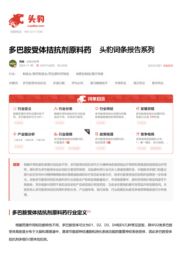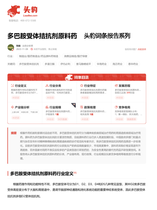 【头豹研究院】【20240124】多巴胺受体拮抗剂原料药 头豹词条报告系列-19页