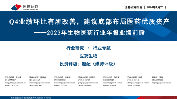 【国信证券】【20240125】2023年生物医药行业年报业绩前瞻:Q4业绩环比有所改善,建议底部布局医药优质资产-21页