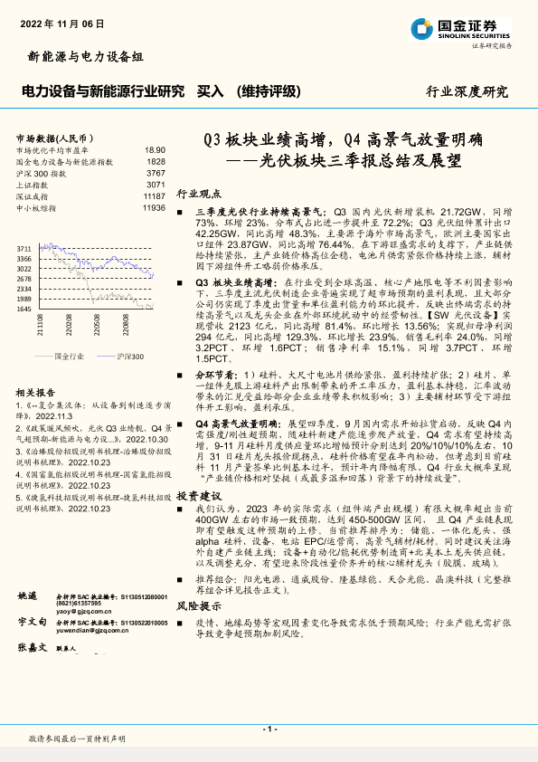 【国金证券】【20221106】电力设备与新能源行业光伏板块三季报总结及展望:Q3板块业绩高增,Q4高景气放量明确-15页