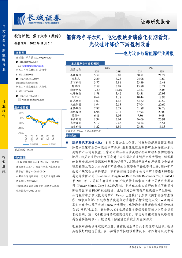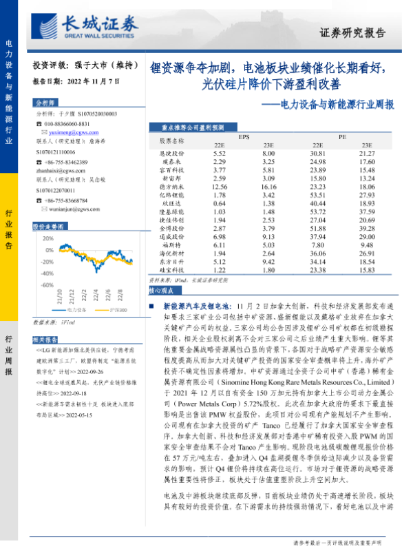【长城证券】【20221107】电力设备与新能源行业周报:锂资源争夺加剧,电池板块业绩催化长期看好,光伏硅片降价下游盈利改善-15页