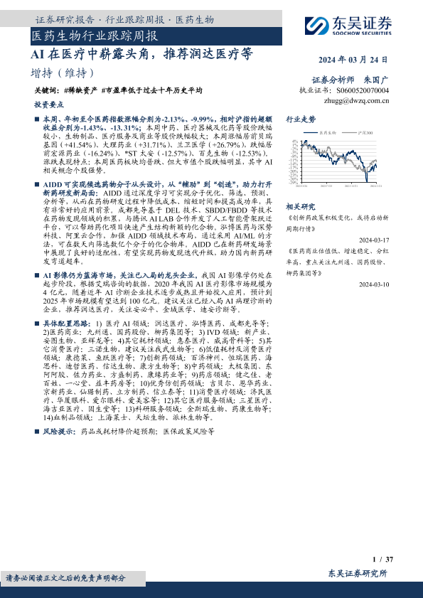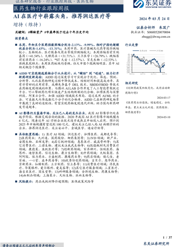 【东吴证券】【20240324】医药生物行业跟踪周报:AI在医疗中崭露头角,推荐润达医疗等-37页