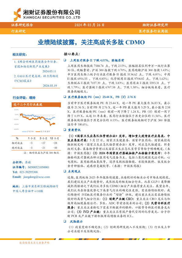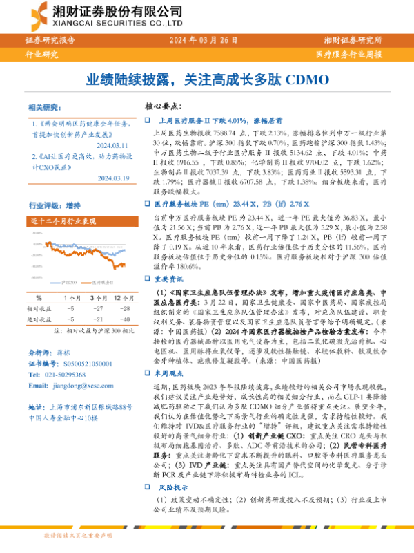 【湘财证券】【20240326】医疗服务行业周报:业绩陆续披露,关注高成长多肽CDMO-13页